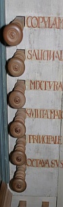 The renaissance single manual is built on two separate windchests. The first contains only the principal choir while the other the flutes. There are ventils allowing either of the windchests to be muted. They may be engaged by drawstops called in italian style "Choro primo" and "Choro secondo". This makes it possible to switch the sound of the organ quickly between the principal plenum and tiny flutes, thus imitating a two manual performance. The table shows how the stops are distributed on the windchests. Before you start to play, please do not forget to pull either the Choro primo or the Choro secondo drawstop to hear any sound at all.