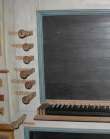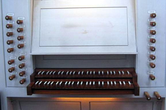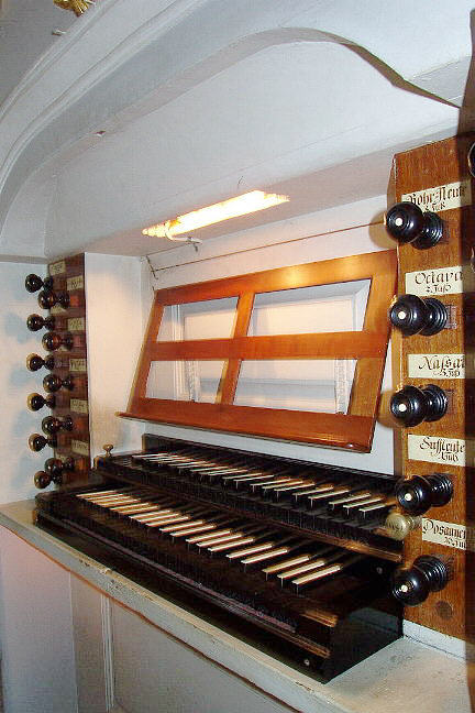 Other, this time very unfortunate restoration, was done in 1941 by E. Hruby. He replaced some of the aliquote stops (both Quints in HW, Quint and Octave 2 in RP) by new "romantic" string stops of the fashion of that time. Besides that he changed the order of keyboards. Originally, the RückPositiv was played from the lower keyboard, the HW from the upper one. Now, the lower keyboard is the Hauptwerk and the RückPositiv is the upper one.