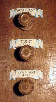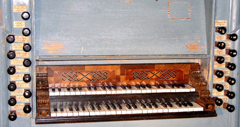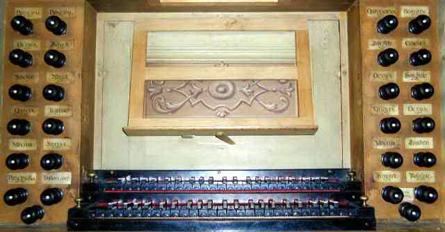 There was a number of restaurations: 1898 J.Fischpera lowered the tuning by physically moving the pipes by a semitone. He also located the drawstops of the RückPositiv onto the stop jambs in the vicinity of the keyboards. Originally, these were placed directly on the RückPositiv itself - though behind the the organist. The original placement of the RückPositiv drawstops may still be observed on the picture.
