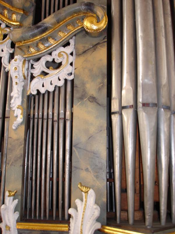 In addition to the full principal chorus the "Ripieno", there are concertant stops, usually represented by the Flute quint (Flauto in duodecima) = a Nazard, and a "recorder"-like voiced Flauto in ottava. The pedal is usually hardcoupled to the manual without any proprietary stops. In the case of St. Carlo, there is one pedal stop named Contrabassi (Subbas 16') which was added in the course of the history.
