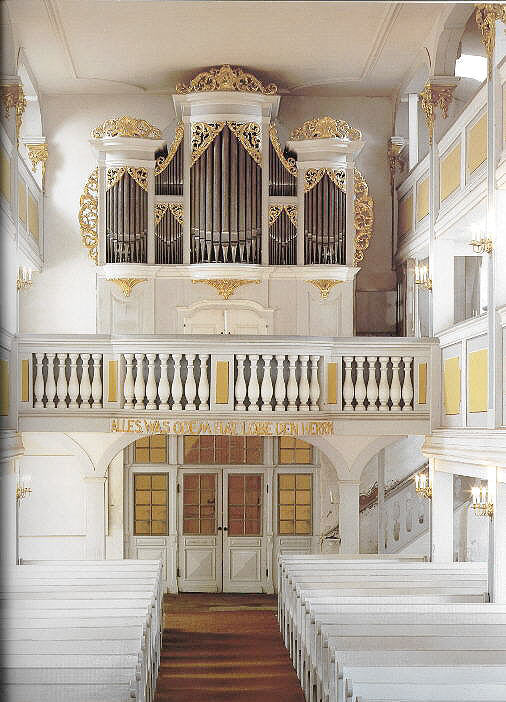 The Gottfried Silbermann organ of St. Marienkirche is what we like to call the "little gem"! Upon completion of its larger 'sister' in St. George, the contract was written up between Freiherr von Friesen and Silbermann on November 12, 1721 to build a new organ with a single manual for St. Marien. The original specification called for 9 stops (omitting the Subbass 16 and the Tertia 1 3/5) and Tremulant. Unfortunately no records exist regarding the addition of these two stops by Silbermann.