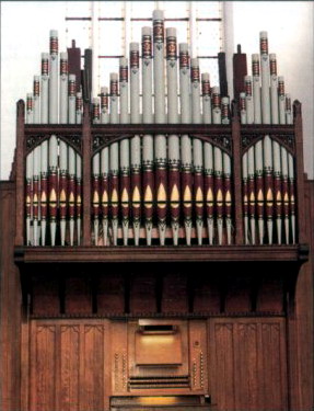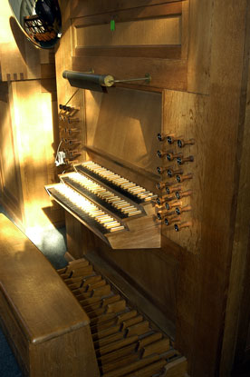 The Great flue work in particular is of typically English classical design - gently voiced and designed to blend with a singing quality. The Great mixture comprises a sesquialtera bass (17.19.22) and cornet treble from middle C (12.15.17) and is thus usable as a cornet in conjunction with the 8 and 4 foot flutes as well as a useful reedy addition to the Great diapason chorus. The Swell mixture is a little less refined starting at 19.22 and breaking back to 12.15 at tenor C for most of the rest of its compass. The swell oboe is particularly forthright, possessing the power of a small trumpet.